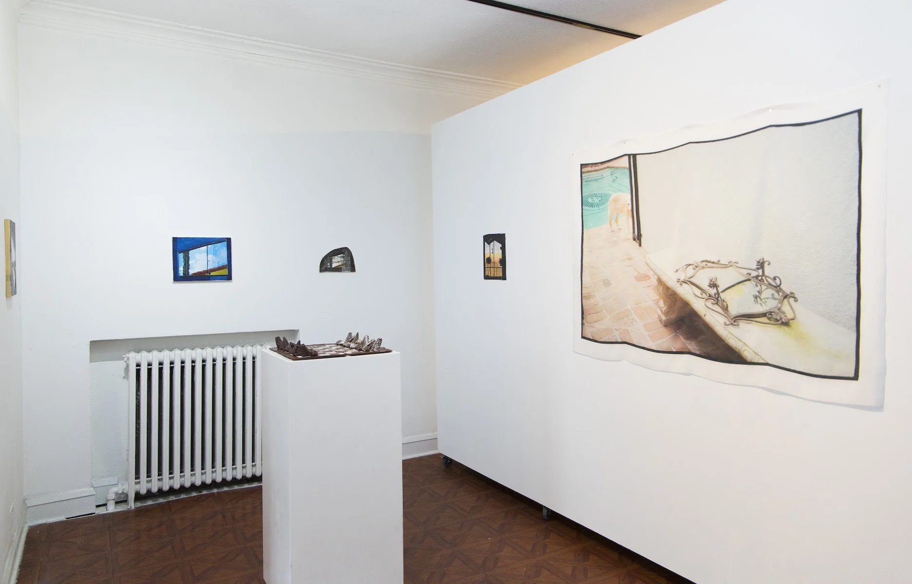 33 mm photograph printed on chiffon, installed here with magnets, 42”x 60”, photographed 2020, printed 2021